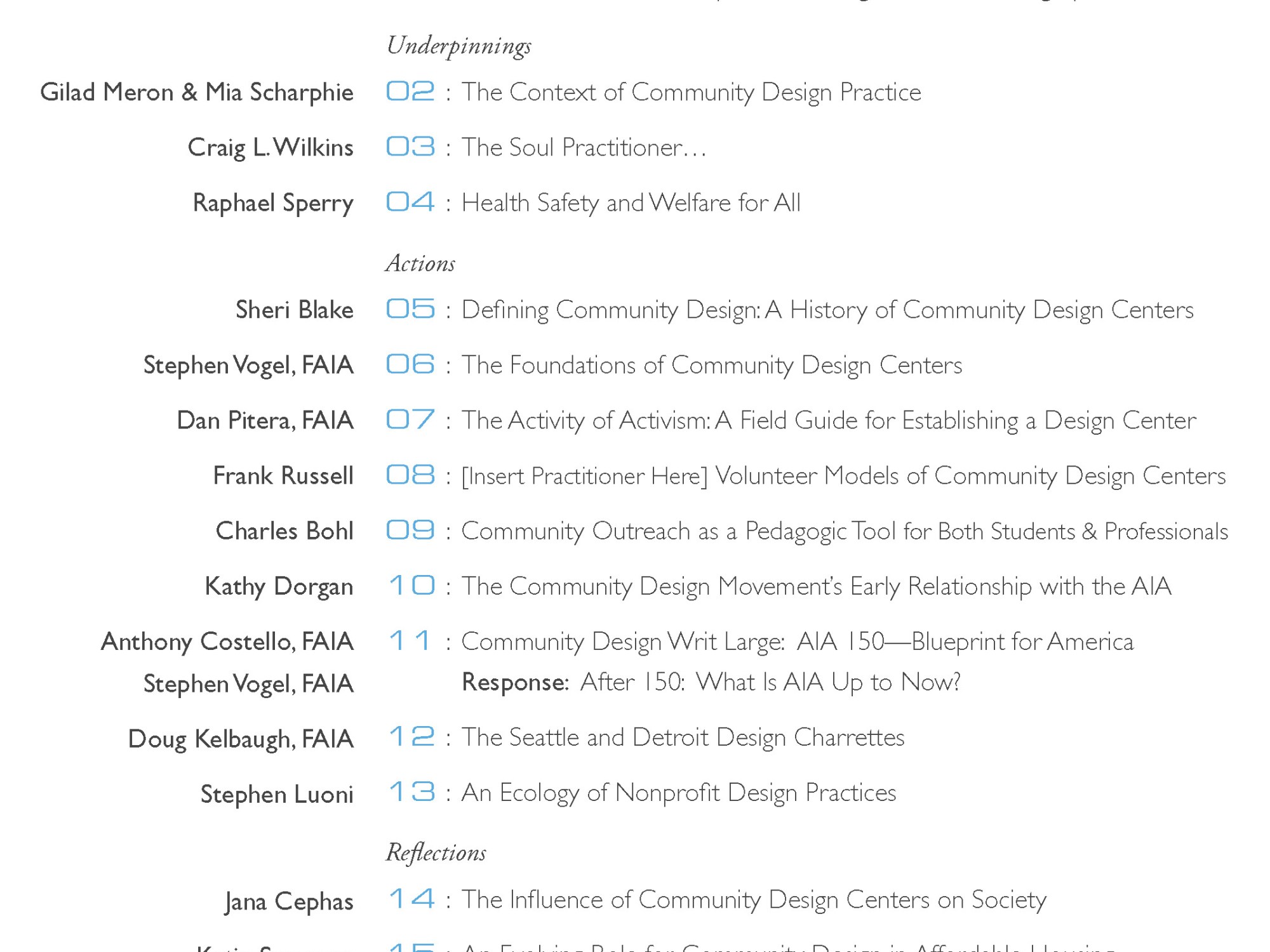 The practice of architecture has become a self-referential, isolated, almost selfish act, due in large part to its inattention to its public duty; for some considerable time, its had to be accountable to nothing but itself. However…what if architecture were to follow the lead of the legal and medical professions and develop a similar social sensibility and call to duty beyond the immediate, personal concerns of its members? What if it were to take the position that it won’t wait for problems of/in the environment to be presented for solution but would actively identify issues and address them? What, then, might the field of architecture look like to both its members and the public? Our volume engages these and many other critical questions about the relationship between the profession of architecture and the public that authorizes it. We address the profession’s lack of both a recognizable ethical claim and institutional infrastructure and propose that the recent rise in the establishment of community design centers across the country is an answer to both. It is a rise that hasn’t gone unnoticed. Robert Ivy, editor of Architecture Record wrote: